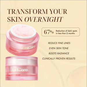 Nói lời tạm biệt với các đốm đen với JustCare Cream—giải pháp chăm sóc da toàn diện của bạn. Công thức giàu dưỡng chất này giúp dưỡng ẩm, làm dịu kích ứng và giúp làm nổi bật vẻ đẹp tự nhiên của làn da bạn.